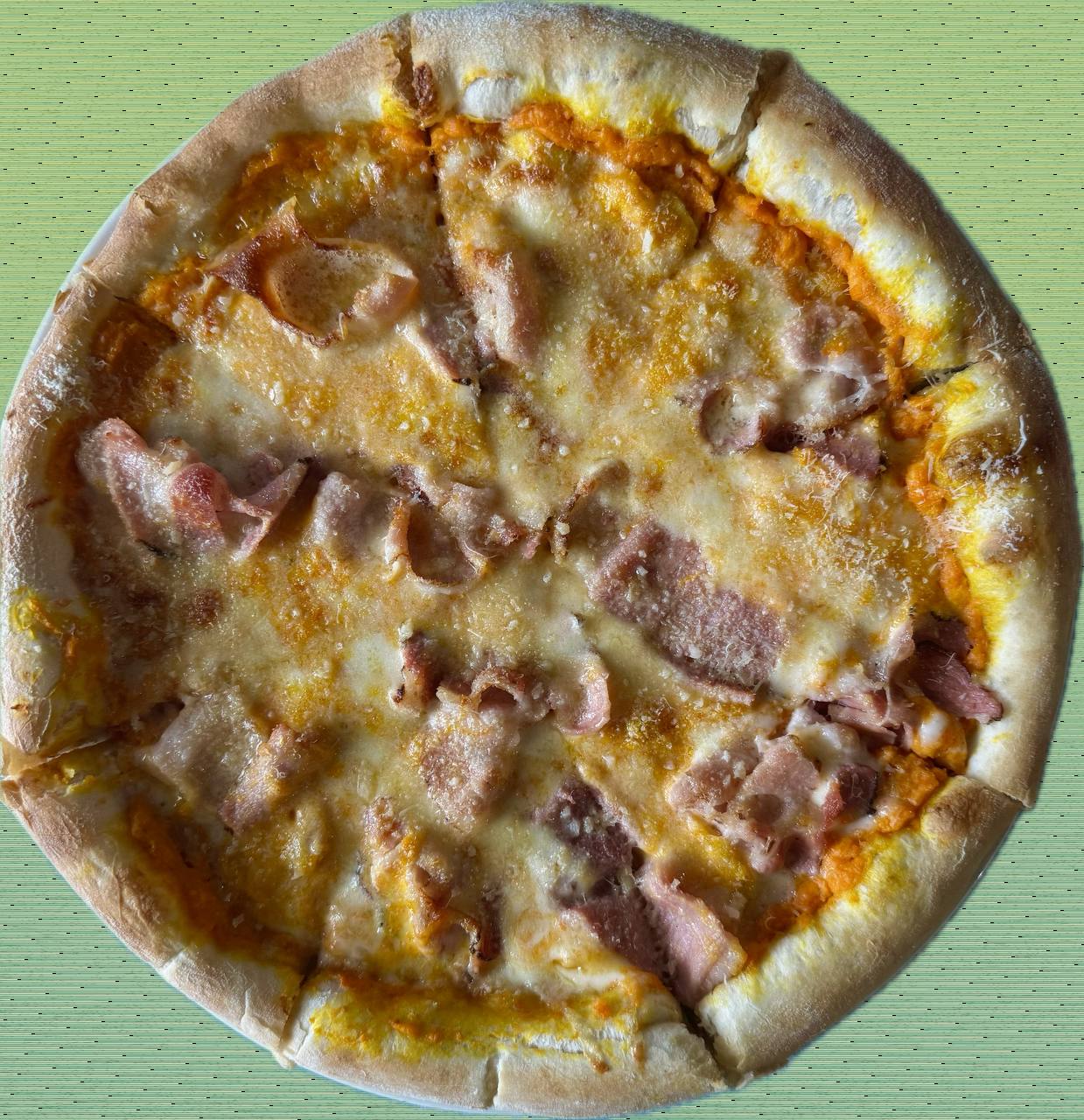 Сливочная основа с тыквой, сыр моцарелла, бекон, сыр пармезан.